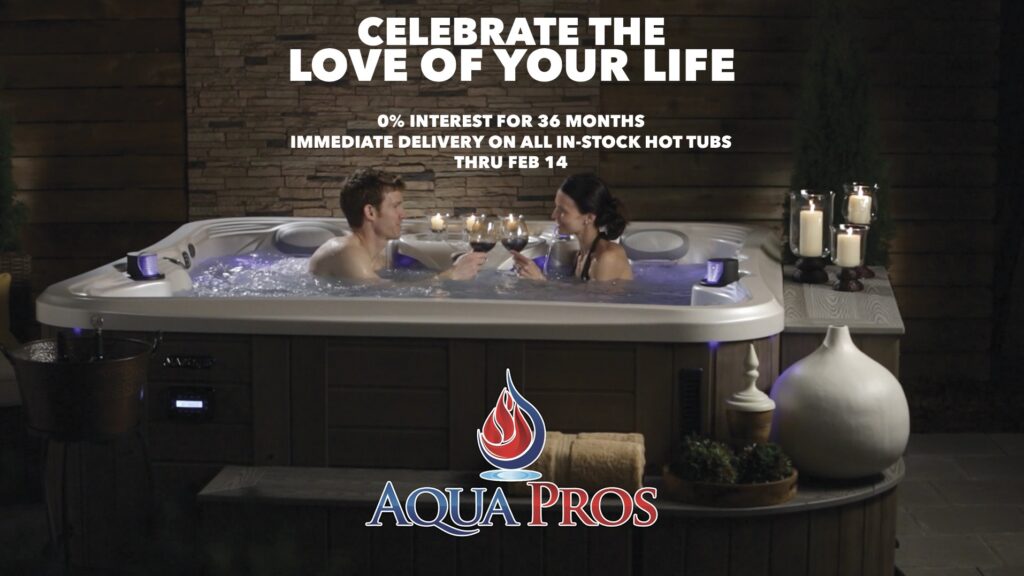 To make this Valentine’s Day even sweeter, Aqua Pros is offering 0% interest for 36 months, along with immediate delivery on all in-stock hot tubs through February 14. That means you don’t have to wait months to start enjoying your new backyard retreat. You can start creating memories almost right away.